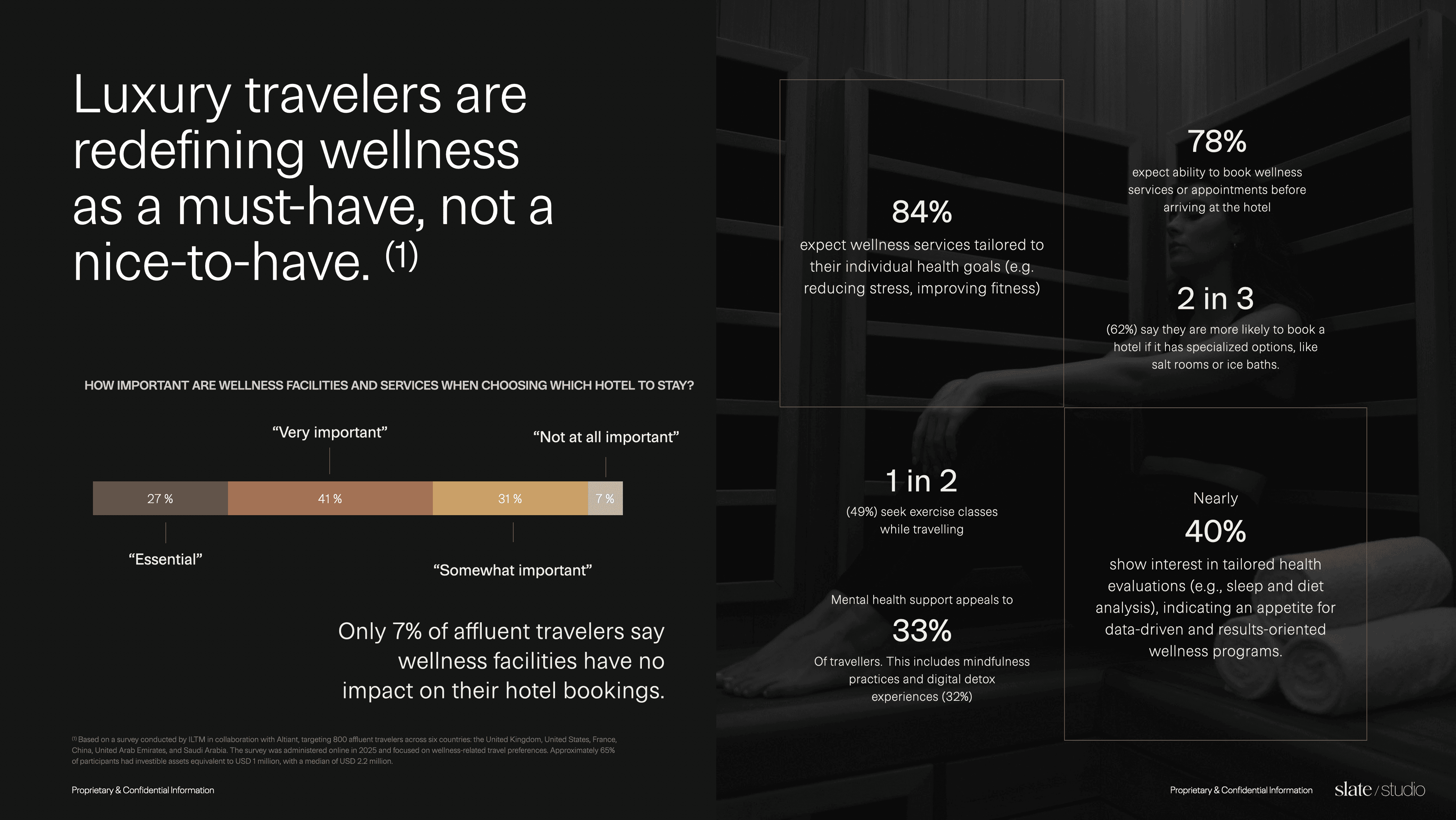 We developed a hospitality-led wellness concept aligned with growing health and wellbeing demand, positioning it as an integrated guest experience rather than a standalone offer. Grounded in market and competitive insight, we defined a clear narrative that shaped the wellness journey across facilities, rooms, and programming, ensuring a cohesive and operationally-robust approach.